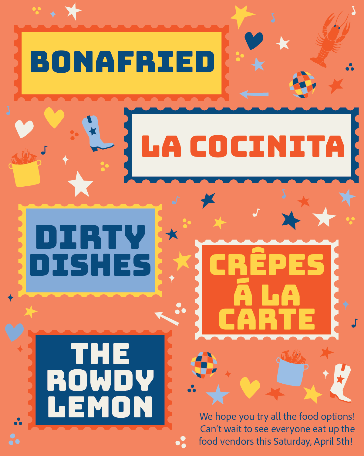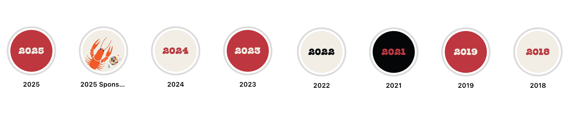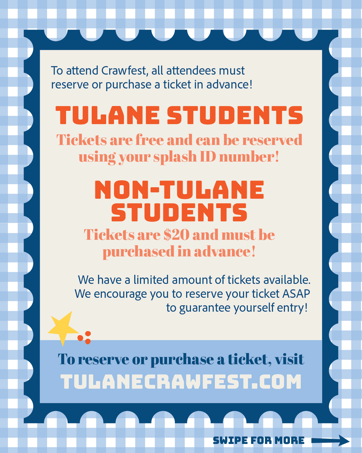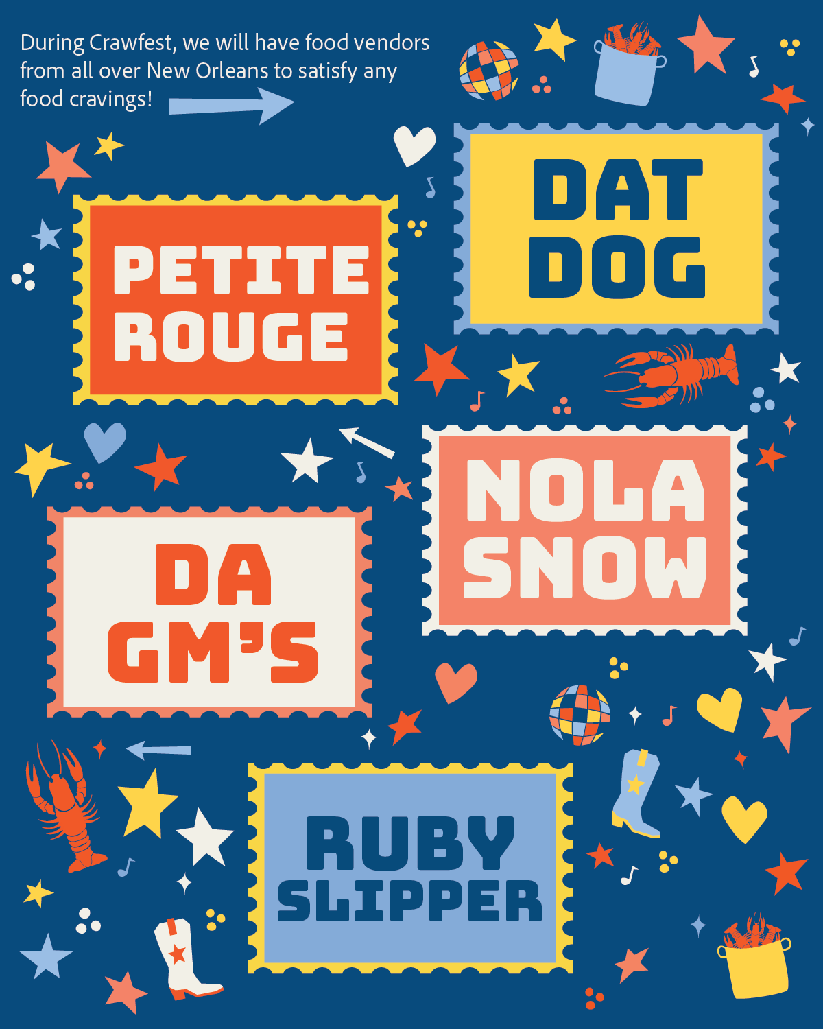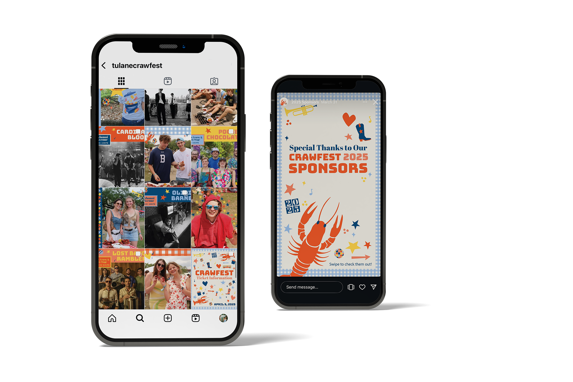 Crawfest is a student-run music, food, and arts festival on Tulane's campus that welcomes over 12,000 attendees. During my time at Tulane, I have served as a volunteer, a Design Board Associate, Co-Designer, and a Content Manager. As a Design Board Associate, I utilized the forever logo branding to create vendor signages directing guests to different locations. For the 2023-2024 school year, I worked closely with the other Designer to create a psychedelic-themed brand inspired by the festival date, 4/20. Over the course of a few months, we put together a brand guide, posters, scrimmages, and vendor signs. As a Content Manager for the 2024-2025 school year, I employed the 2025 Crawfest branding to create content for Instagram and TikTok.